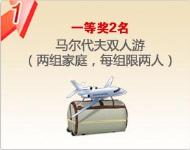 1、一等奖马尔代夫双人游为旅游网站提供的标准旅游产品。