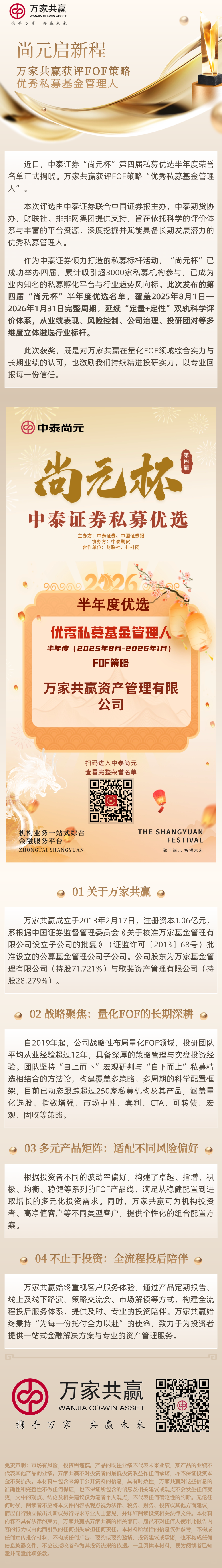 理财资讯 投研观点更多>> 降息预期与地缘风险交织,全球风险资产继续承压2026/03/26 特朗普关税风波跌宕起伏,A股节后春季躁动可期2026/03/06 A股震荡攀升,避险情绪推动金银价格再创新高2026/01/30 央行开年宣布“政策大礼包”, A股“历史最大成交”后如何演绎?2026/01/23 美联储如期降息25个基点,三部门发文更大力度提振消费2025/12/19 新闻资讯更多>> 地缘博弈持续演绎,静候市场拐点2026/04/03 “十五五”规划纲要正式发布,美联储领衔“全球央行超级周”2026/03/20 2026年经济增长预期目标公布,中东原油断供恐慌席卷全球2026/03/13 美伊冲突爆发,关注两会与地缘冲突走向2026/03/06 特朗普再挥关税大棒,央行连续15个月增持黄金2026/02/13 公司公告更多>> 万家共赢获评FOF策略“优秀私募基金管理人”2026/04/03 债券交易相关人员信息公示表2026032026/04/03 202511董监高公示2025/11/07 欢迎各位投资人监督我司廉洁从业工作2025/08/22 万家共赢办公地址变更公告2025/06/12